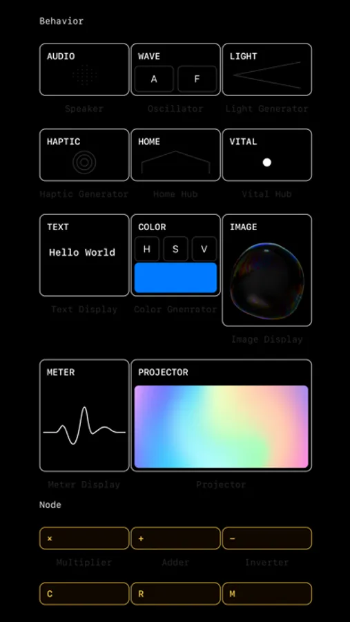 The six sensors resemble the human sensory system - sight, sound, touch, motion, body, and info. The behaviors include a wide way of output such as light, vibration, sound, images, and even smart home controls.