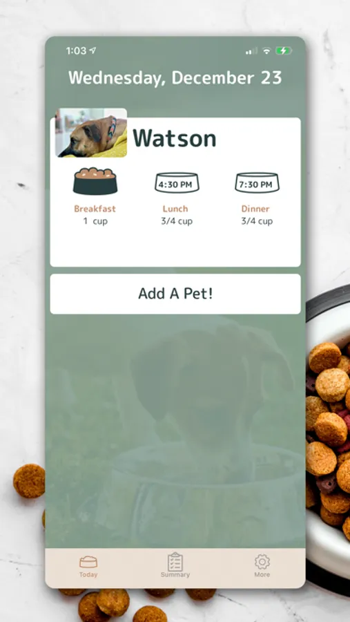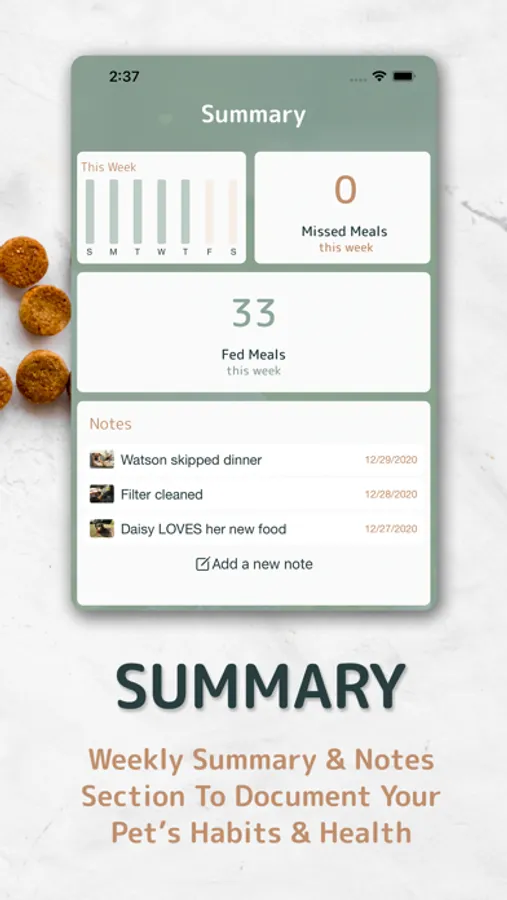 The Summary tab lets you check back on your week to make sure no one missed a meal! Or use the Notes section to take notes about your pet’s habits and health.