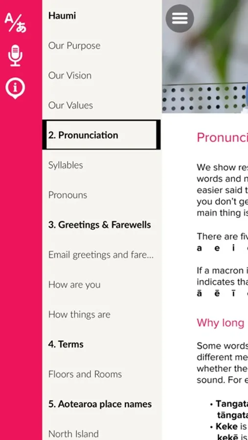 The app includes information on Te Reo Māori (the Māori language), Tikanga (customs), mātāpono me ngā ūaratanga (principles and values), karakia (prayers/ affirmation) and waiata (songs).