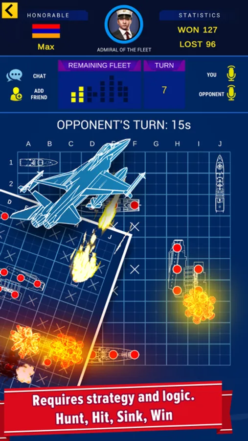 Warship Battle is the classic naval combat game that brings together competition, strategy, and excitement. In head-to-head battle, you search for the enemy's fleet of ships and destroy them one by one. No ship is safe in the Warship Battle game of stealth and suspense. Try to protect your own fleet while you annihilate your opponent's. It's a battle that you must win!