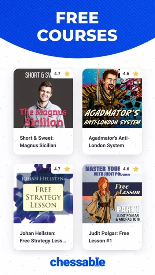 Openings, endgames, tactics, strategy, you name it - Chessable has a course on it! And they’re taught to you by world-class instructors and players, including Magnus Carlsen, Anish Giri, Judit Polgar, and more.