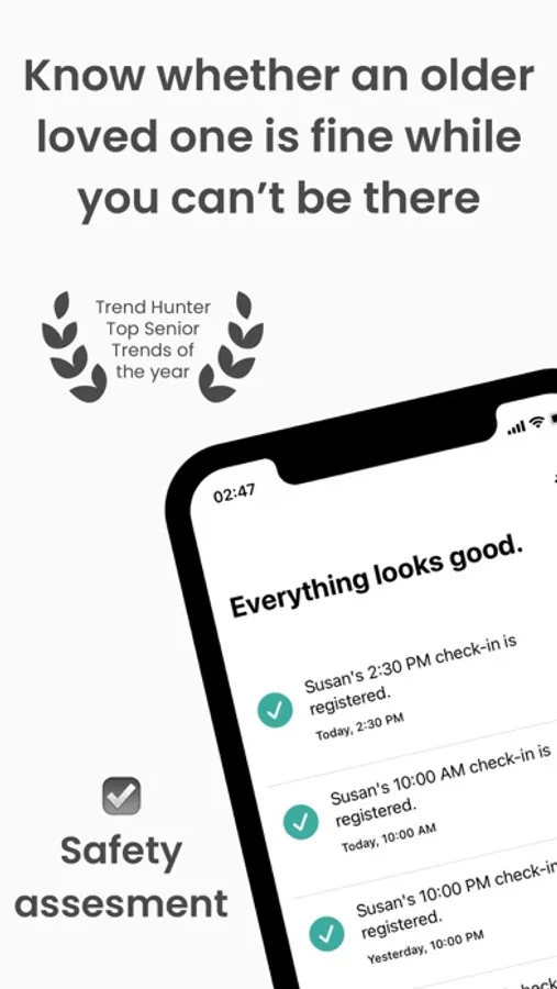 - SAFETY CHECK-INS: Your parent has a new routine: checking in. A few times a day, during specific time slots, your parent submits an in-app check-in.