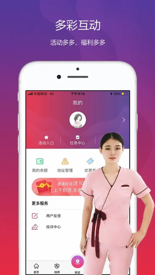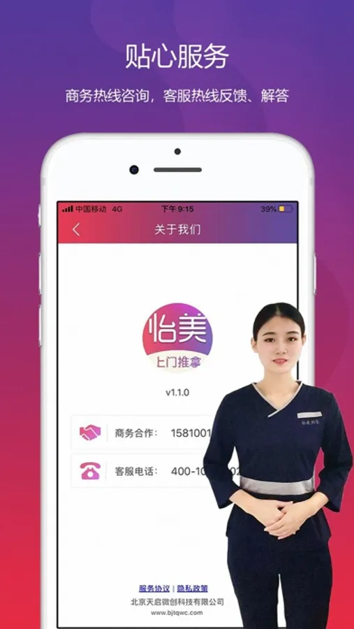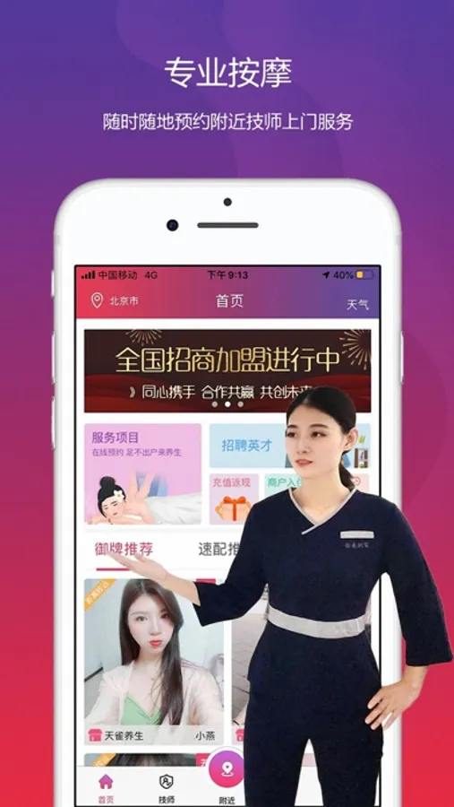 怡美到家平台是一款oto上门服务平台,汇集了多类健美养生项目,如:上门推拿按摩SPA、美睫美甲、产后修复、面部保养等。怡美到家平台一直以用户良好的体验为宗旨,快速发展线下资源和优化产品,争取第一时间给客户带来一份健康贴心的保障。现如今,怡美到家平台开展全国招商活动,已开通几十个城市。希望大家关注健康,关注怡美,用怡悦的心情和美丽的笑脸面对生活,用一尊健康的身体来关爱、呵护家人。一键下单,极速上门,瞬间焕您怡美的身心健康!