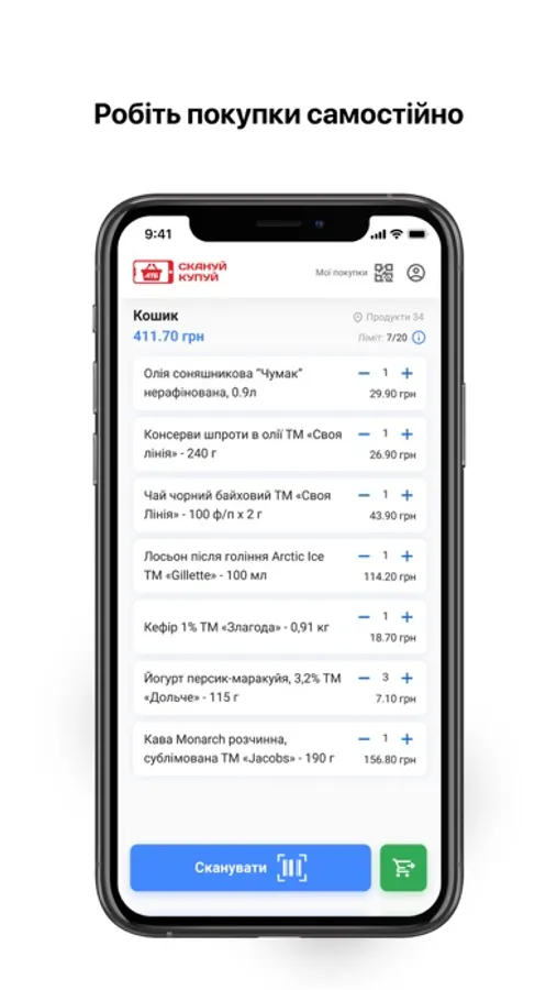 Завантажуй додаток «Скануй-Купуй» та здійснюй покупки без черг, з особливими умовами придбання товарів та акціями від наших партнерів.