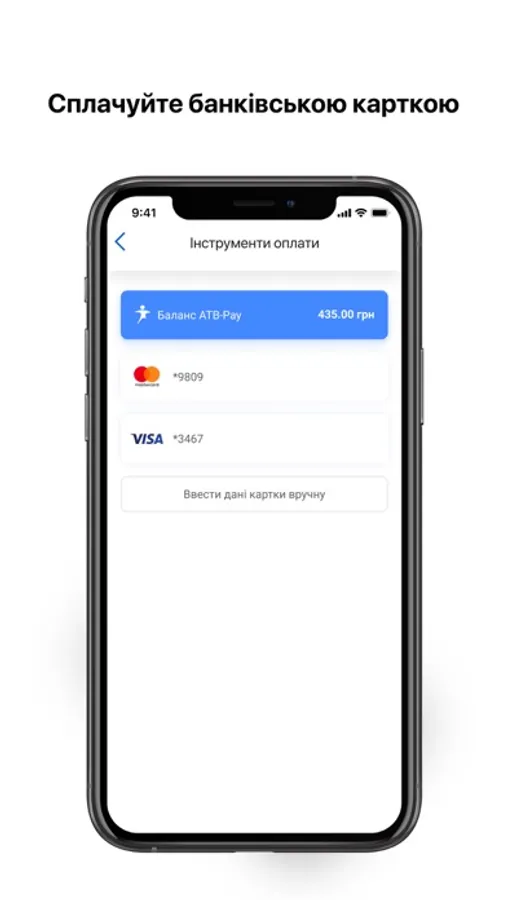 - банківська карта (ввести номер перший раз та CVV для підтвердження платежів);