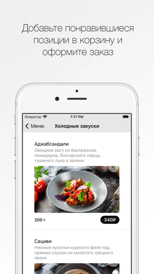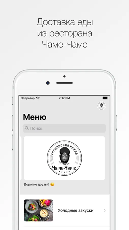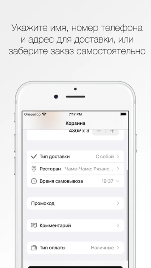 Как сделать заказ в приложении “Чаме-Чаме”: выберите понравившиеся позиции из меню, добавьте их в корзину и перейдите на экран оформления заказа (по нажатию на иконку корзины).