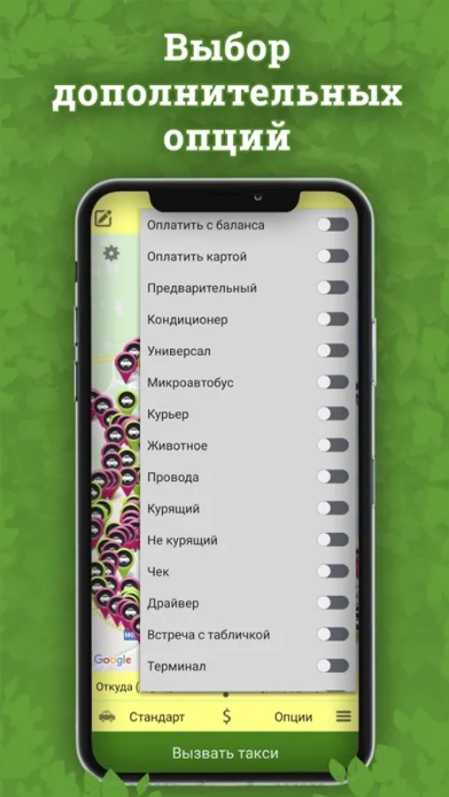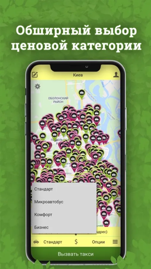 - Возможность вызвать такси разного класса (Эконом, Стандарт, Микроавтобус, Комфорт).