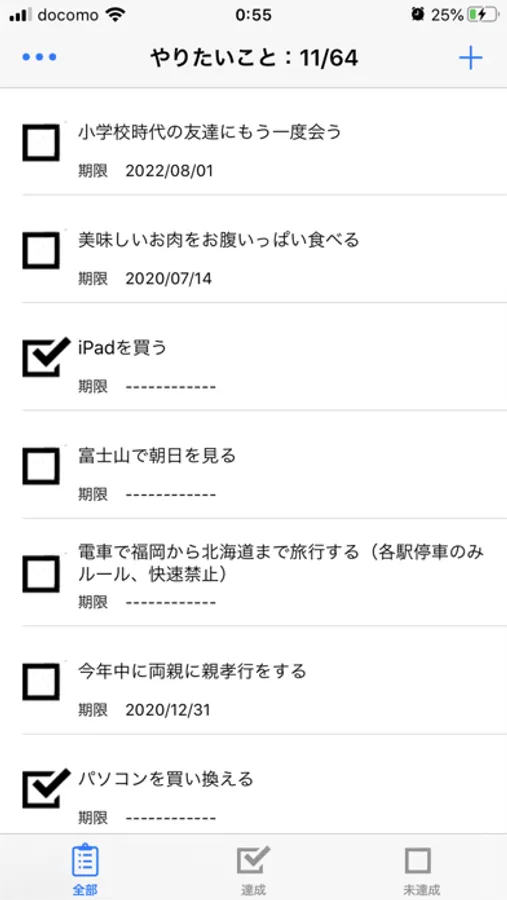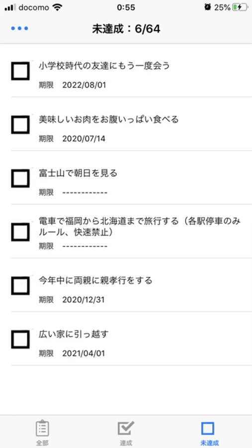 やりたいことを達成したときに左側の四角をタップするとチェックマークを入れることができます。