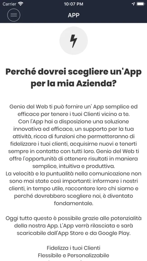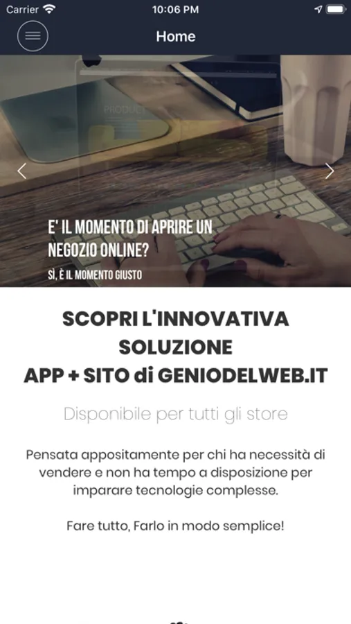 Genio del Web è una piattaforma che comprende: App dedicata alla tua attività con Nome, Logo e colori personalizzati. Sito Web di ultima generazione su nome a dominio a tua scelta. Pannello per gestire in autonomia tutti i contenuti, inviare newsletter, notifiche push, gestire ordini e prenotazioni, Tessere Punti, prodotti e molto altro. Pratici Espositori da tavolo per invitare i tuoi clienti a scaricare la tua App. Scarica ora GEnio del Web e scopri come fare! Prenota una consulenza gratuita e senza impegno, ti spiegheremo tutto!