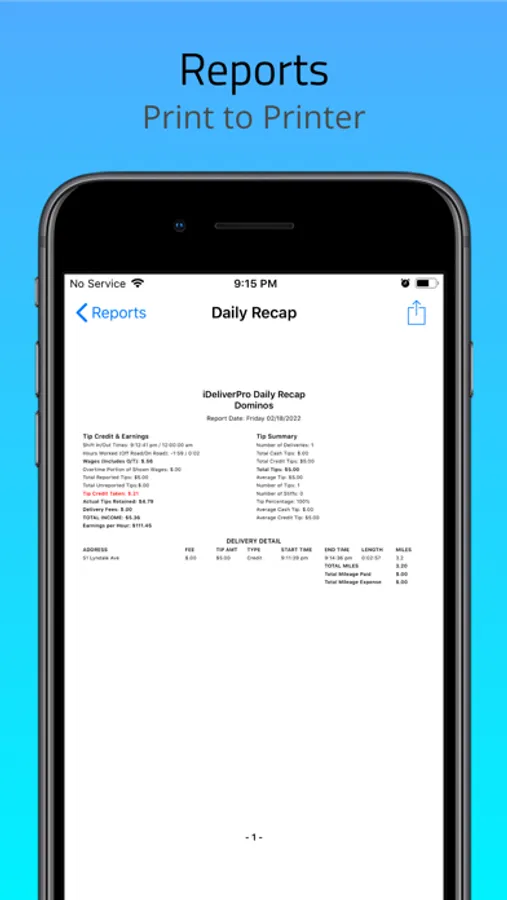 After you "clock out", you can see, or optionally print, a Recap of your day's shift. This recap includes tip statistics; wage, delivery fee and Tip Credit results and a list of all addresses served including Start Times, Finish Times, Trip Times, Miles Driven, Mileage Reimbursement (if any) and Mileage Expense based on the current Federal Mileage Deduction Rate.