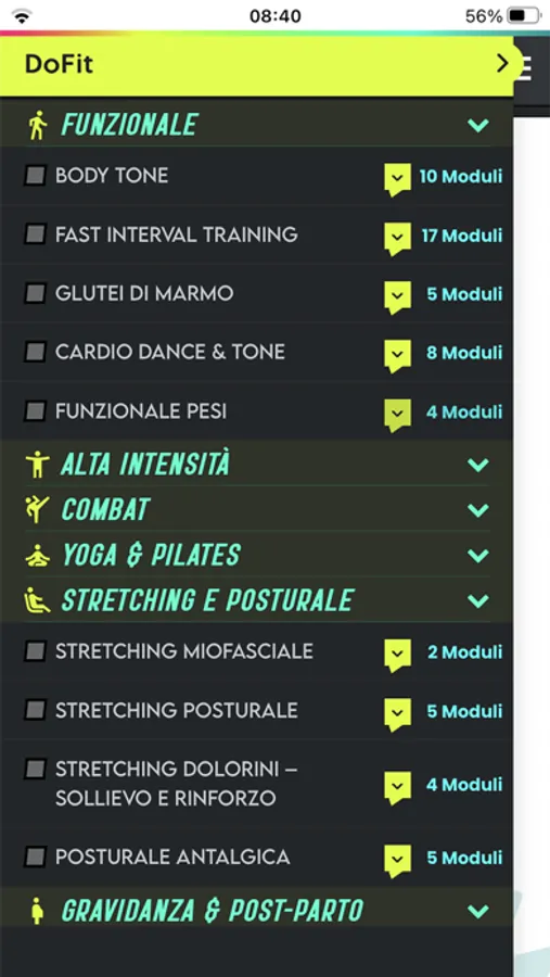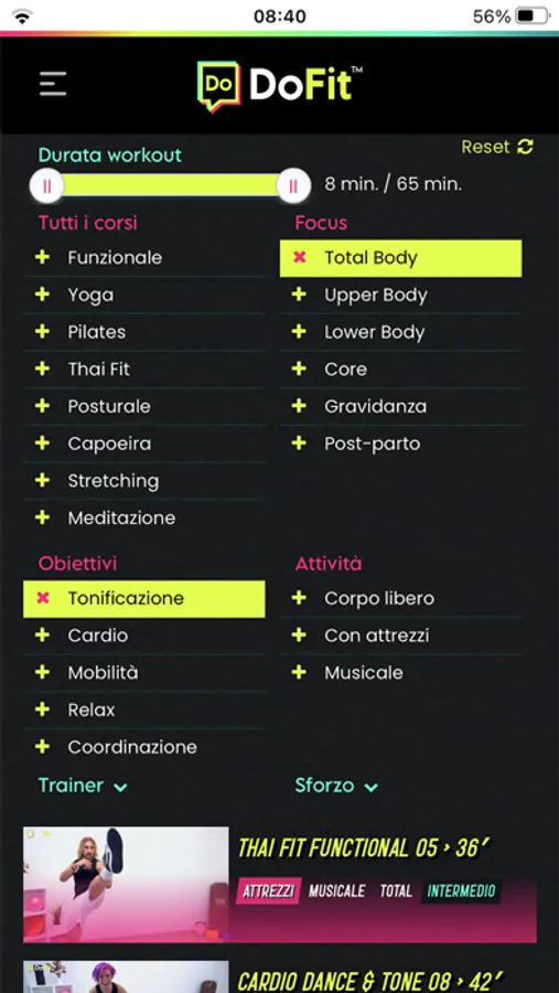 Su DoFit trovi fitness, yoga, capoeira, pilates, thai fit, dance, meditazione e molto altro oltre a corsi specifici per bambini, anziani, persone in recupero da un infortunio e gravidanza con workout da 8 a 60 minuti. E non solo. Menu stagionali, ricette vegan e fit e una libreria di contenuti approfonditi su alimentazione, psicologia, hobby, genitorialità e stili di vita. Tutto a pochi centesimi al giorno su smartphone, tablet, pc e smart tv.
