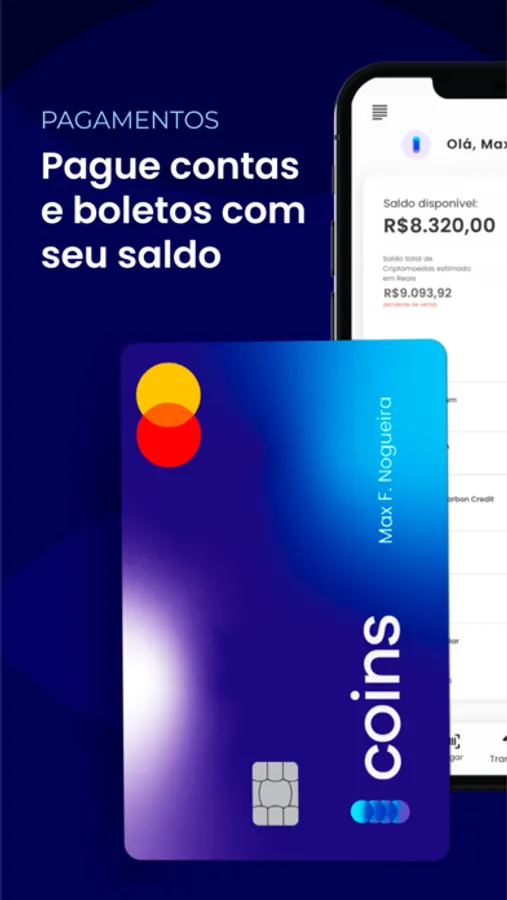 Cartão CoinsCard para usar o seu saldo em Reais ou em outra moeda para pagar online e presencialmente onde quiser, e sacar dinheiro nos mais de 23 mil caixas eletrônicos espalhados no Brasil.