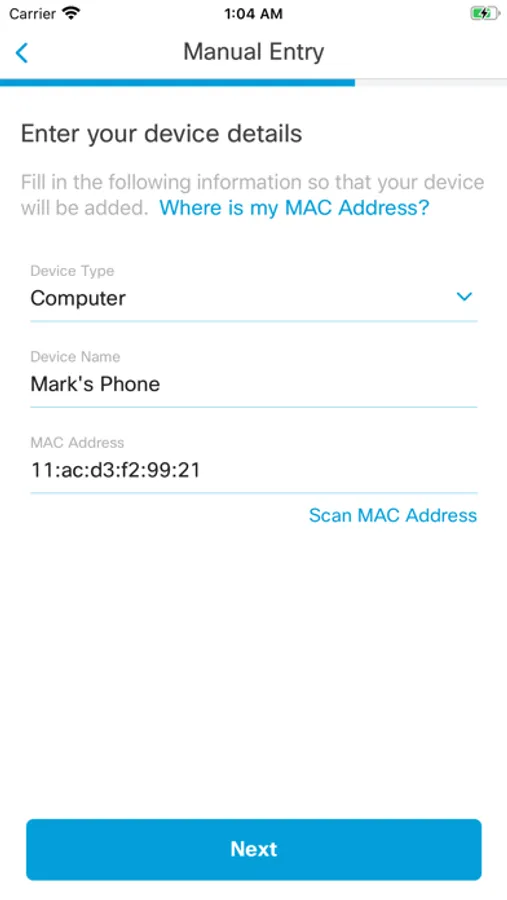 Manual entry: Users can manually enter device details: type, name and MAC address.