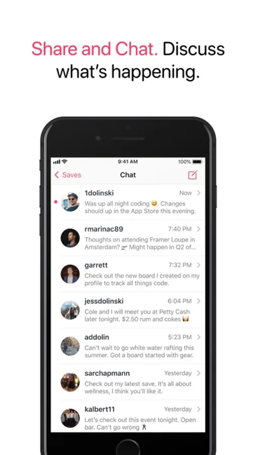 The best saves will float to the top of the discovery page for everyone to see. Happen chat allows people to share privately in groups.