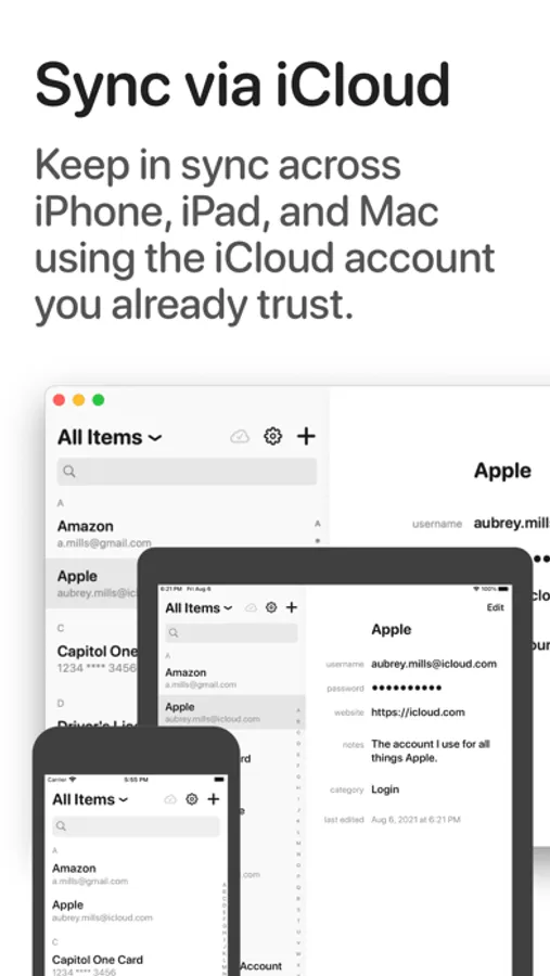 Minimalist keeps all your data in sync across iPhone, iPad, and Mac using the iCloud account you already trust. Your devices sync ridiculously fast and your data remains secure and private, even from us. Learn more at https://minimalistpassword.com.