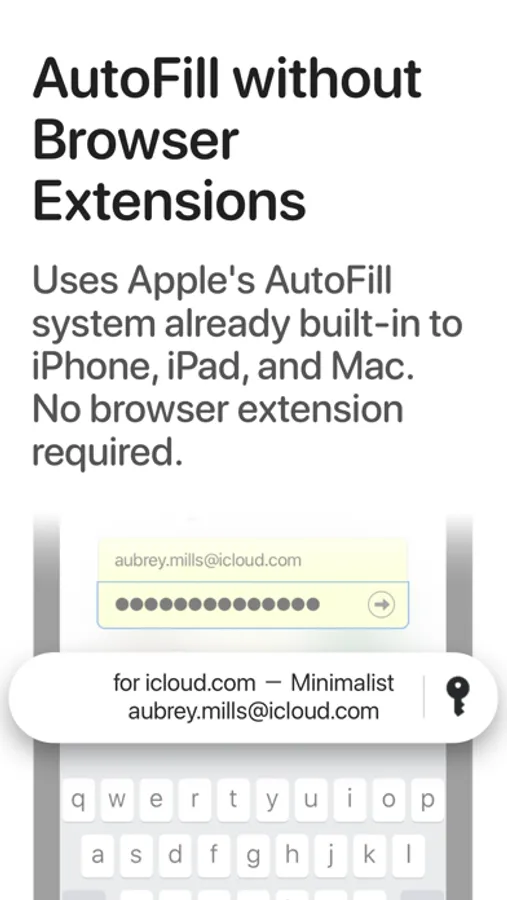 Minimalist supports Apple's AutoFill system already built-in to iPhone, iPad, and Mac. No browser extension required. Quickly and securely sign-in to websites and apps without revealing your browser content or browsing history. Learn more at https://minimalistpassword.com.