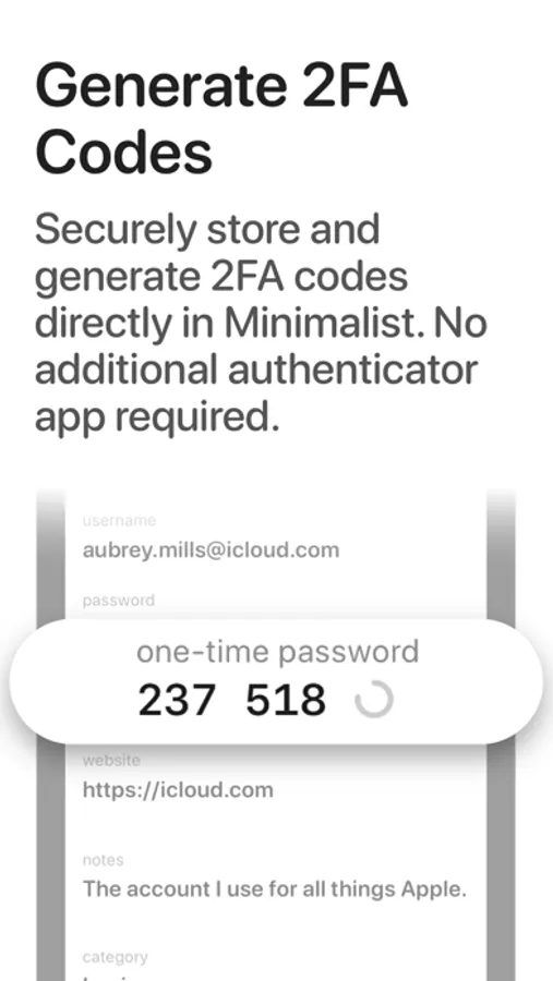 Securely store and generate 2FA codes directly in Minimalist. No additional authenticator app required. All your login information lives in one place, available on all your devices. Learn more at https://minimalistpassword.com.