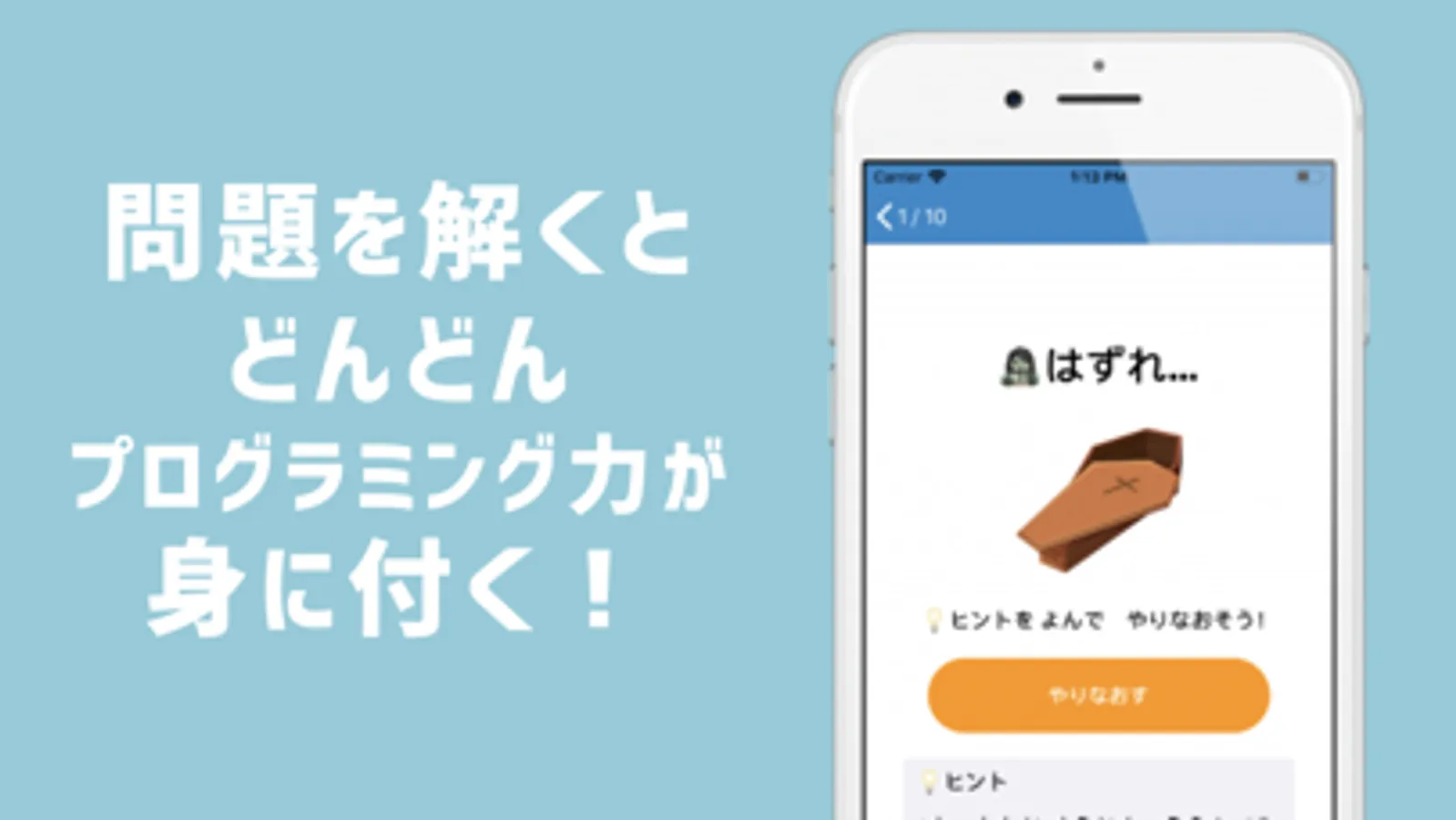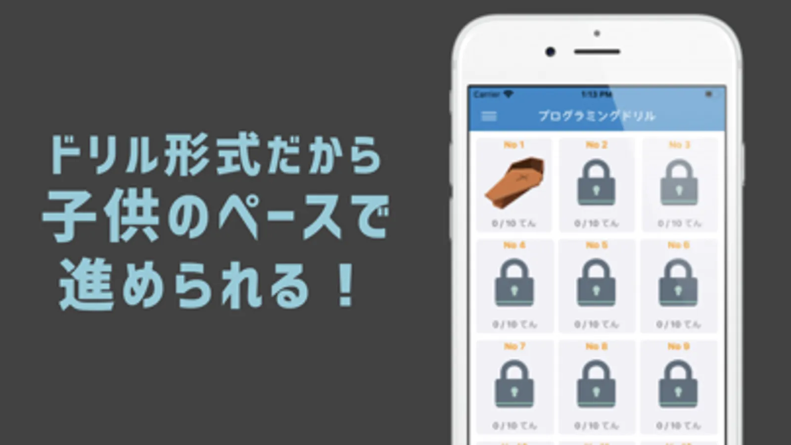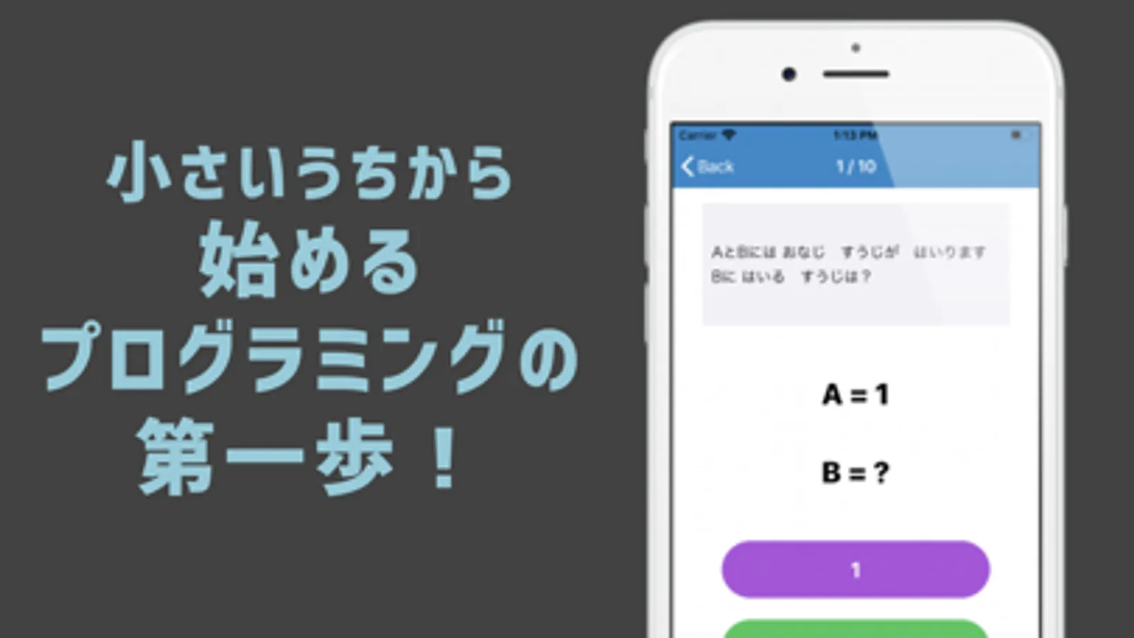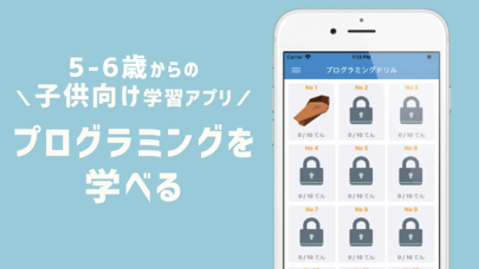 簡単な計算式を解いたり数を数えたり、ドリル形式で学習を進めることでプログラミングの基本的な考え方が身に付く子供向けのプログラミング学習アプリです。