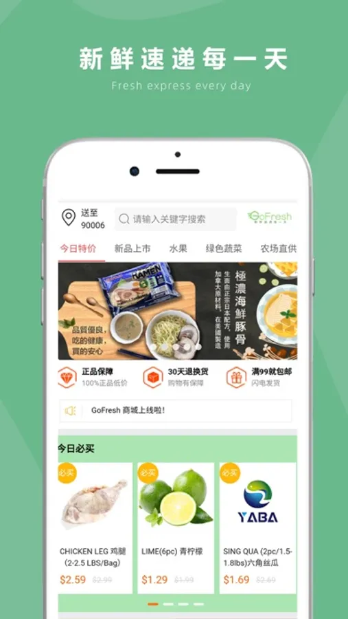 GO FRESH以专注打造一站式配送服务平台!商品品类包含鲜活海鲜、蔬菜、肉禽牛奶、粮油调味、休闲食品等。GoFresh希望以全新的商业模式。更高效快捷的仓储配送模式、致力成为更快、更好、更多、更省钱的在线零售平台,为消费者带来更极致的购物消费体验。