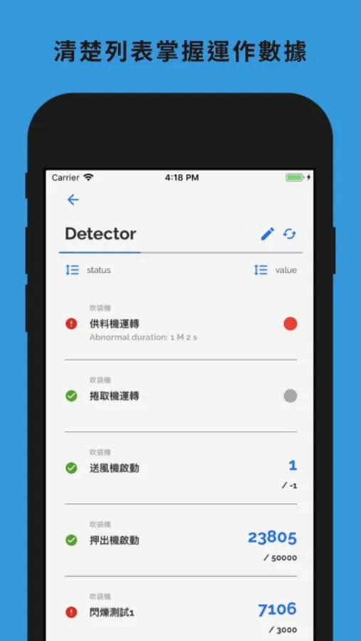 當設備出現異常,即時透過 APP 通知,縮短異常處理時間、提升稼動率。