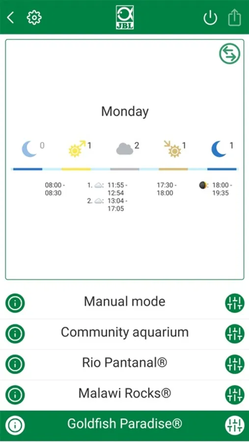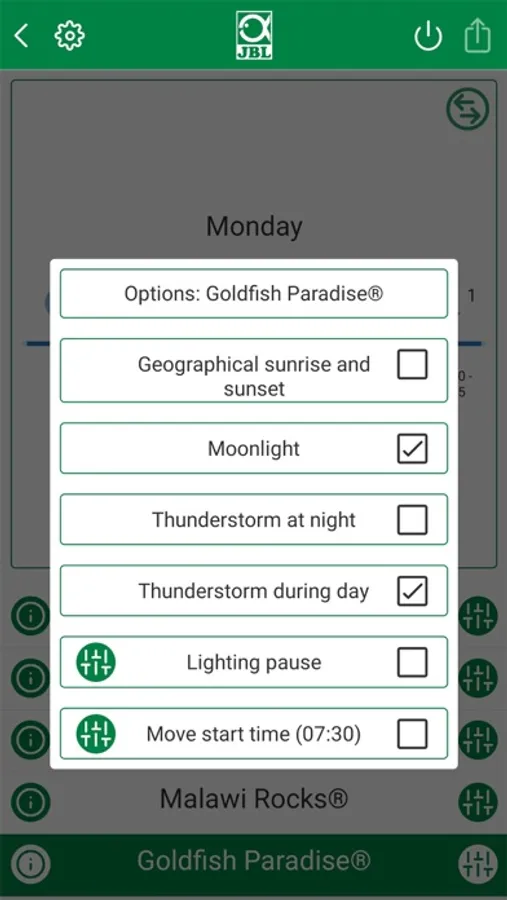 Geographically correct lighting data from South America (PantanalRiver®), Africa (MalawiRocks®) and Southern China (GoldfishParadise®) can be selected.