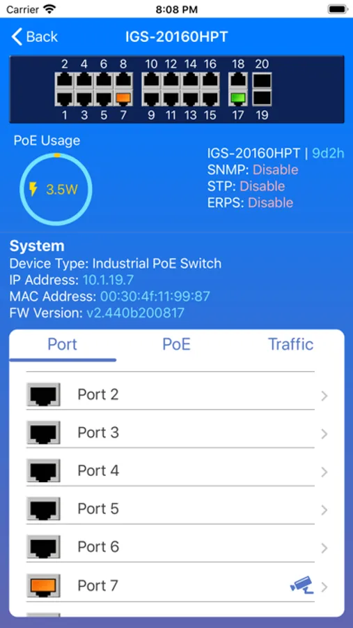 ● Monitor details of each switch and router such as port, PoE, VLAN and L2 services.