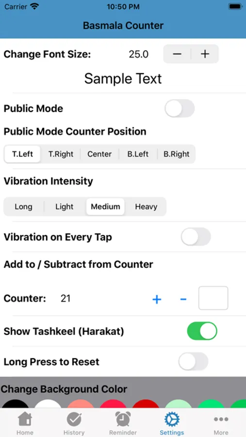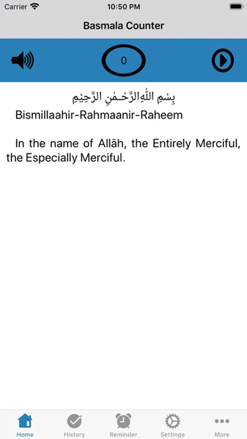Basmala Counter application includes Arabic Font, transliteration in English and also the English meaning. Basmalah Counter app remembers the last number that you were on while performing the recitation so that you can continue from where you left off when you relaunch the app.