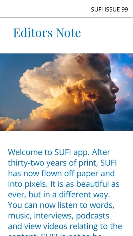 SUFI explores diverse aspects of mysticism, spiritual thought and practice through articles, interviews, poetry, narratives, art, reviews and much more.