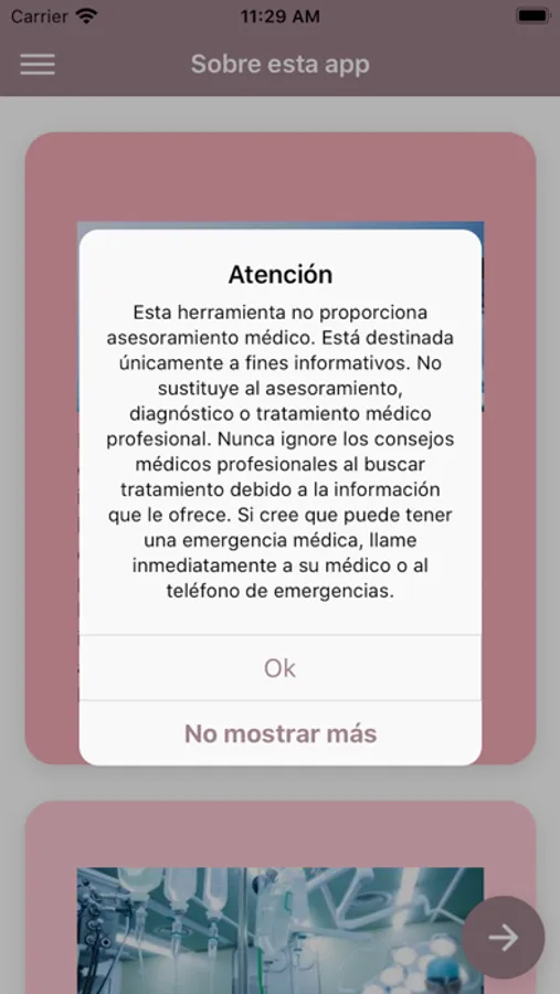 ADVERTENCIA: Esta app no proporciona asesoramiento médico. Está destinada únicamente a fines informativos. No sustituye al asesoramiento, diagnóstico o tratamiento médico profesional. Nunca ignore los consejos médicos profesionales al buscar tratamiento debido a la información que le ofrece. Si cree que puede tener una emergencia médica, llame inmediatamente a su médico o al teléfono de emergencias.