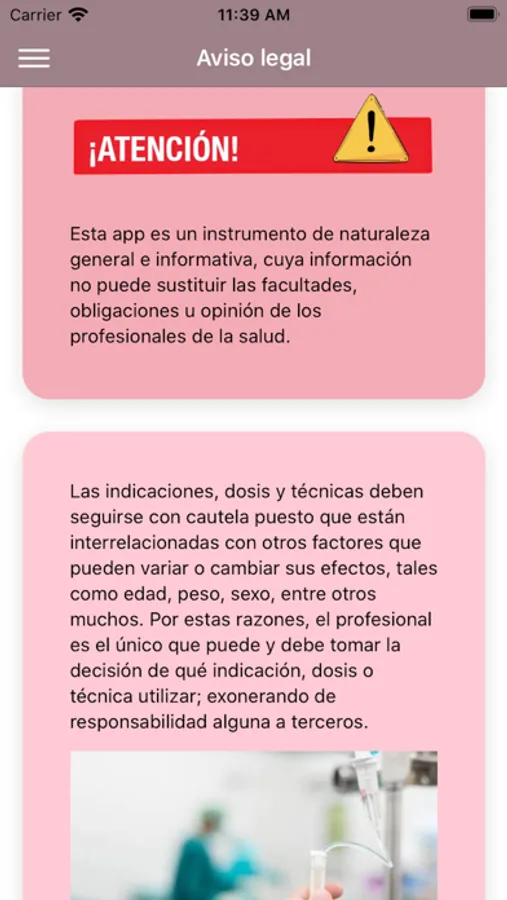 Esta app es un instrumento de naturaleza general e informativa, cuya información no puede sustituir las facultades, obligaciones u opinión de los profesionales de la salud. Las indicaciones, deben seguirse con cautela puesto que están interrelacionadas con otros factores que pueden variar o cambiar sus efectos. Por estas razones, un profesional es el único que puede y debe tomar la decisión de qué indicación, dosis o técnica utilizar; exonerando de responsabilidad alguna a terceros.