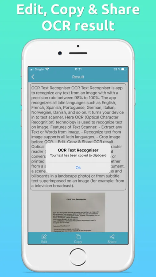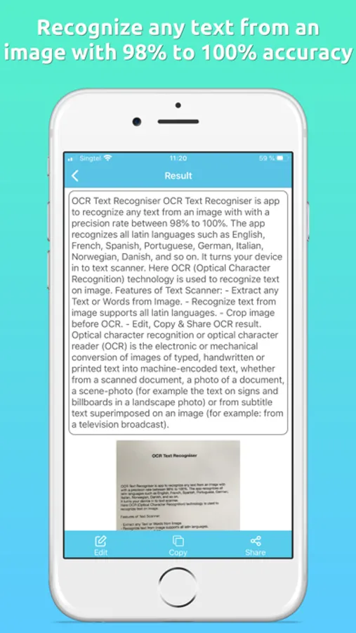 OCR Text Recogniser is app to recognize any text from an image with with a precision rate between 98% to 100%. The app recognizes all latin languages such as English, French, Spanish, Portuguese, German, Italian, Norwegian, Danish, and so on.