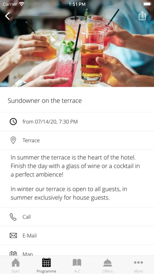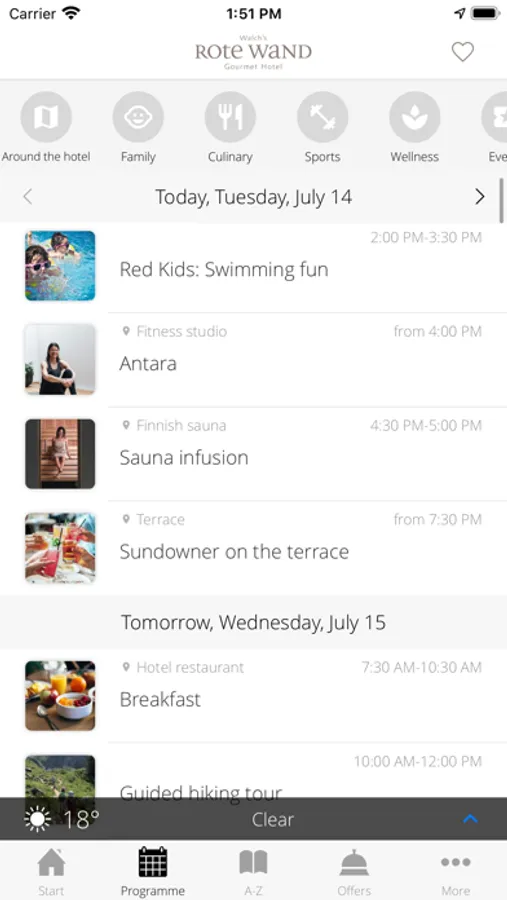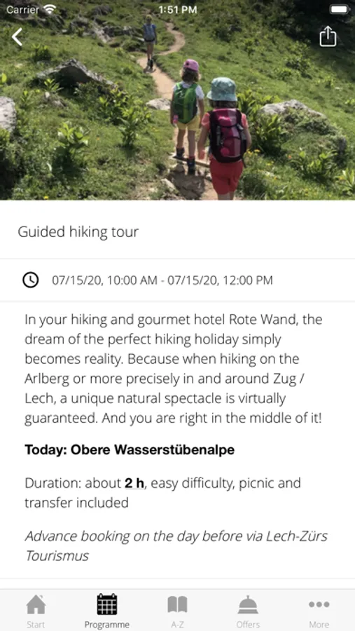 Filter according to various interests such as gourmet, wellness, activities, or family. Put together your own programme of activities and information. In this way, the app offers content tailored to your personal needs.