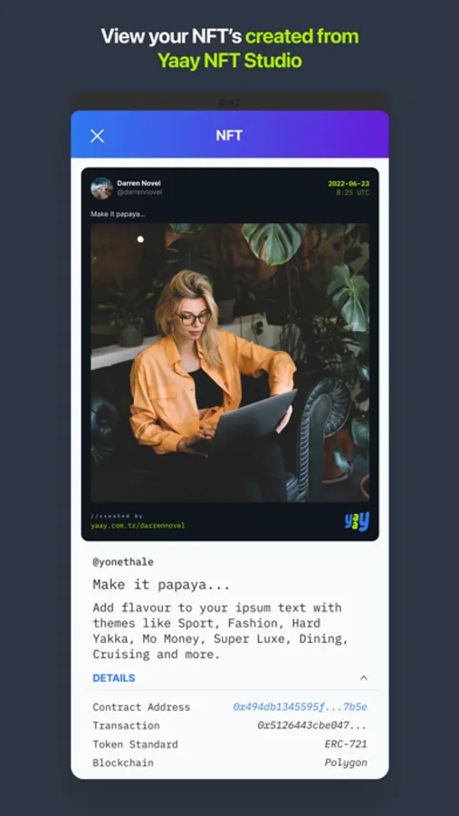 VIEW YOUR NFT’S THAT ARE CREATED FROM YAAY NFT STUDIO: Yaay is the only social media platform in the world where you can directly create NFT’s from your posts within the platform, using Yaay NFT Studio. Part of Yaay ecosystem, you can also view your NFT’s from your account using your application.
