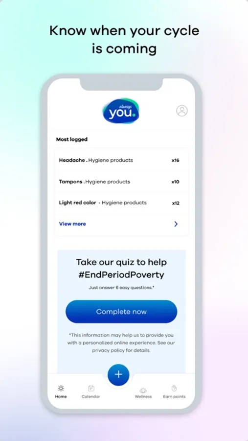 *For every new Always You registration and for every 100 Donation Points earned between 7/1/23-6/30/24, Always will donate one period product to Feeding America, up to a maximum donation of 1,000,000 pads. Earn 20 points for every period or bladder leak event tracked with a maximum of 200 Donation Points for period events per month, 10 donation points per day by completing all Microsteps, and 5 donation points for each piece of content consumed.