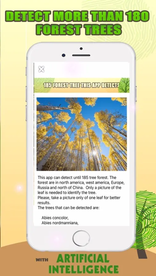 This app can detect until 185 tree forest. The forest are in north america, west america, Europe, Russia and north of China. Only a picture of the leaf is needed to identify the tree.