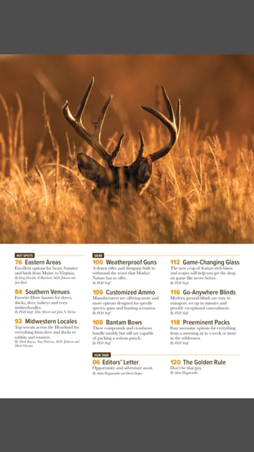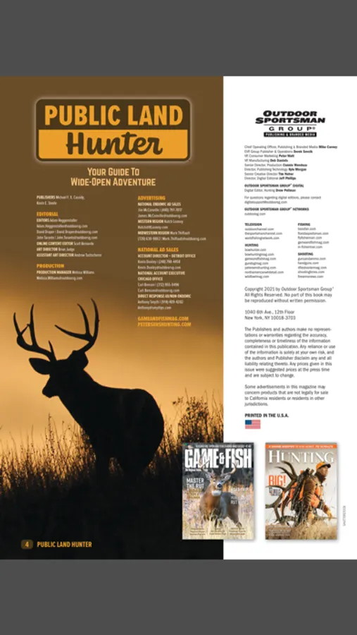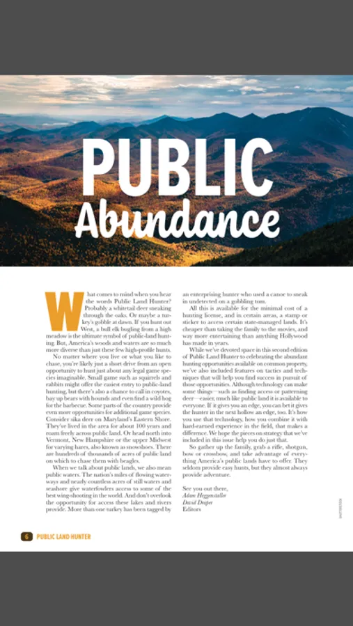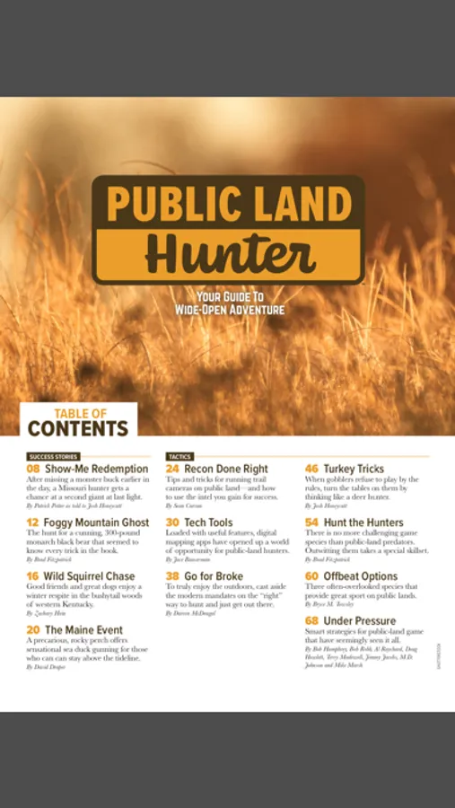 Public Land Hunter blends proven tactics and cutting-edge gear with local knowledge and where-to-hunt advice to give readers inside information on the best public-hunting opportunities in the eastern half of the United States, where most of America’s hunters live. From federally managed national forests to state parks and wildlife management areas, Public Land Hunter provides a guide to more than 100 of these opportunities in 35 states. In addition, readers will find tips and techniques for hunting whitetails, turkeys, waterfowl, upland birds, small game and more on public land, from how to locate and pattern pressured game to strategies for avoiding crowds. Reviews of top gear that gives hunters an edge on public land are also included, covering firearms, bows, optics, treestands, trail cameras and more. Find consistent success on public land by making Public Land Hunter part of the plan.