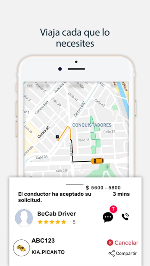 3. Una vez que un conductor más cercado acepte tu solicitud, podrás ver su información y ladel vehículo en el que viajarás. Podrás revisar la ubicación del conductor y el tiempo que letomará llegar por ti. Además, podrás contactarlo a través de mensajes o llamadas.