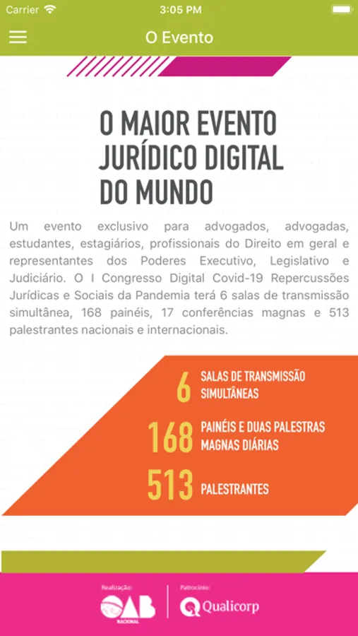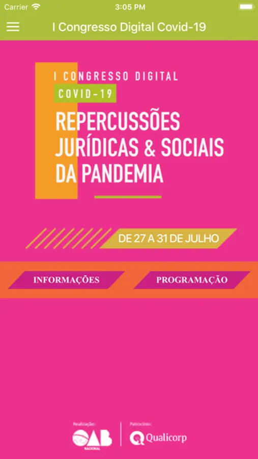 Aplicativo da ESA Nacional para o I Congresso Digital COVID-19: Repercussões Jurídicas e Sociais da Pandemia. Permite ao usuário consultar a programação, assistir ao evento ao vivo, acompanhar as notícias em destaque, obter informações importantes sobre o congresso e entrar em contato direto com a ESA.