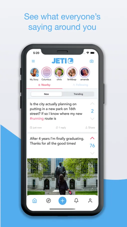News, jokes, memes, shout-outs, and local discussions all have a place on Jeti. Create a poll to get opinions from people nearby.