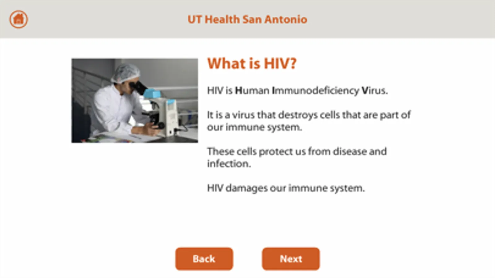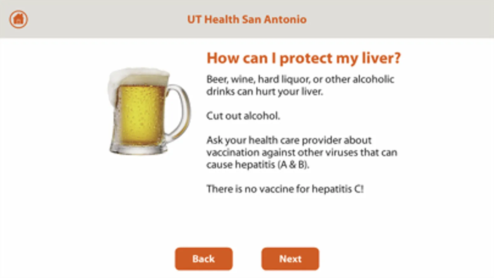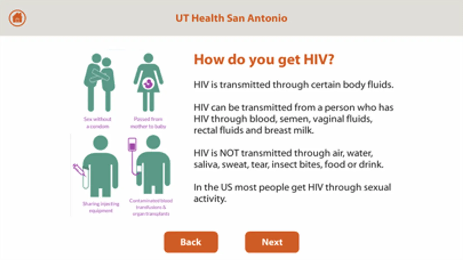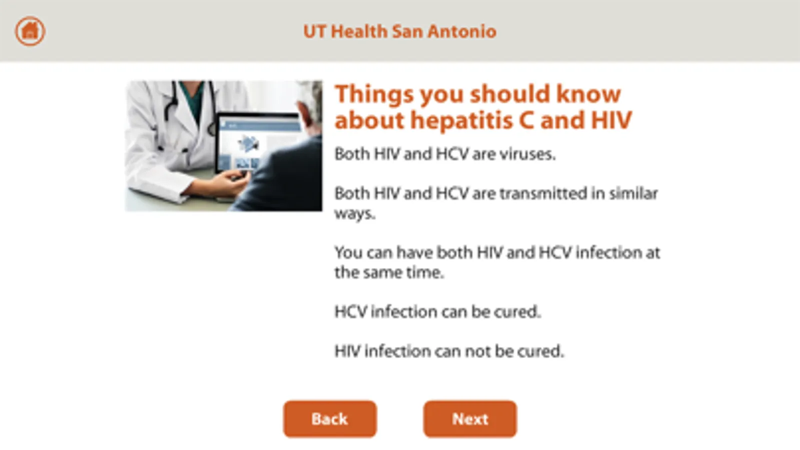 HIV/HCV Education is a tool that health educators/ providers can use with patients or that patients can use on their own. The focus is educating newly diagnosed patients about human immunodeficiency virus (HIV) and hepatitis C (HCV) including risk factors, prevention, transmission, testing and treatment. Developed by UT Health San Antonio, the patient focused app provides information that is easy to read and understand and integrates teach-back questions to test knowledge gained from the app.