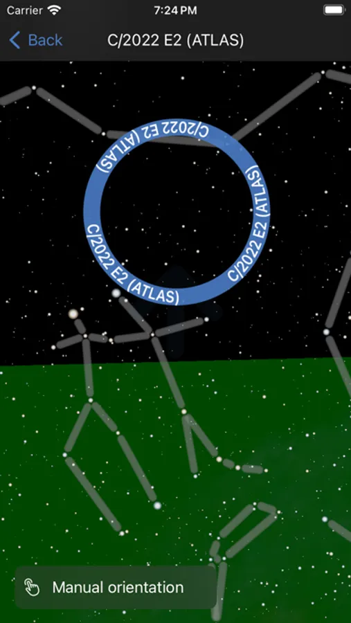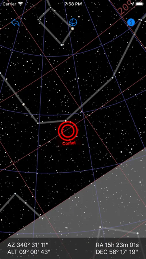 This app helps you locate all bright comets currently visible in the night sky. Just hold your device up to the sky and find the red target marker on the screen. That's where the comet is! The app uses your location and up-to-date ephemerides from the NASA JPL's Horizons database to calculate the comet's position.