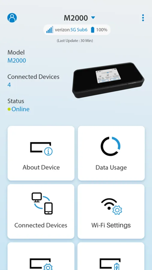 The Mobile App provides cloud-based device management features for all Inseego 5G devices, including FWA devices and mobile devices like the M2000 MiFi hotspot or the Skyus160 IoT gateway. The device management features of the app allow you to configure and manage all your Inseego devices on your smart phone, from anywhere in the world.
