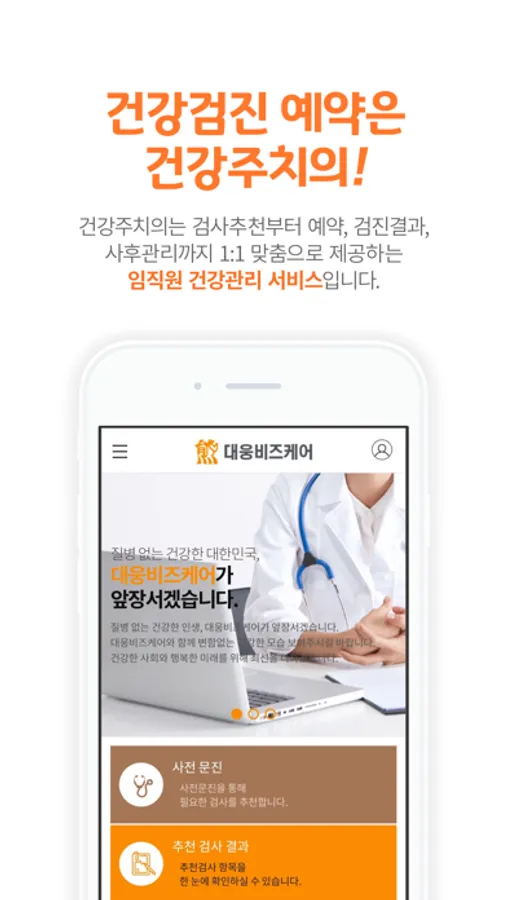 건강주치의 앱은 대웅제약 임직원에게 제공하는 대웅 비즈케어 건강검진 예약서비스 입니다.
