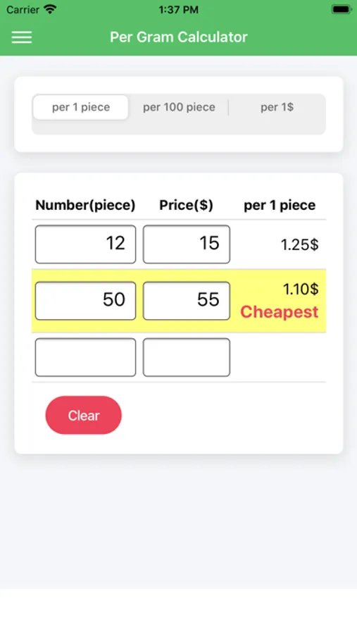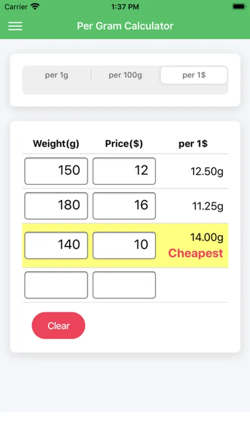 It is a free app that allows you to easily find the lowest price by calculating the price per gram of multiple products.