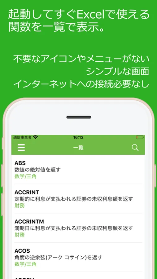 アプリを起動すると、登録されているExcel関数の一覧が表示されます。