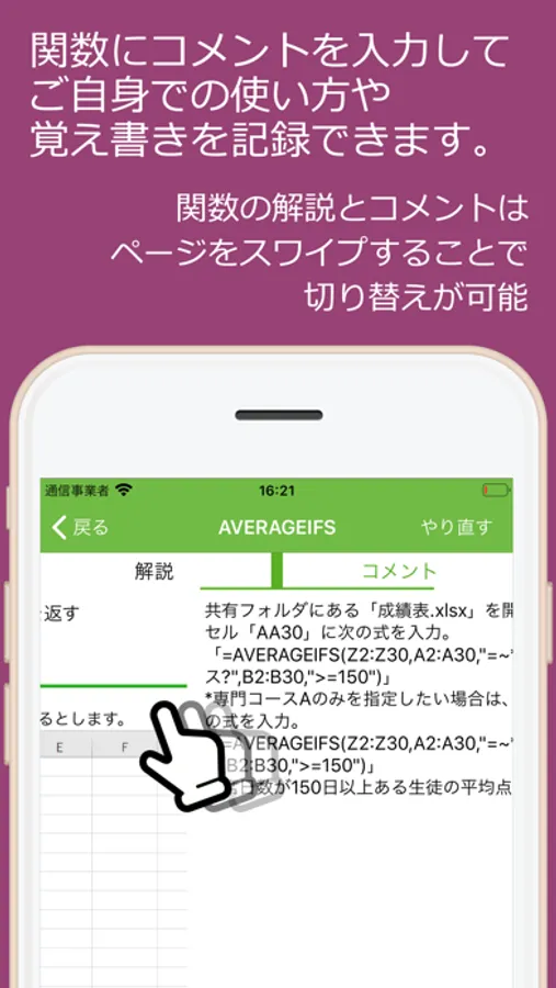 Excel関数の解説画面を左にスワイプすると、その関数に対してコメントを入力することができます。