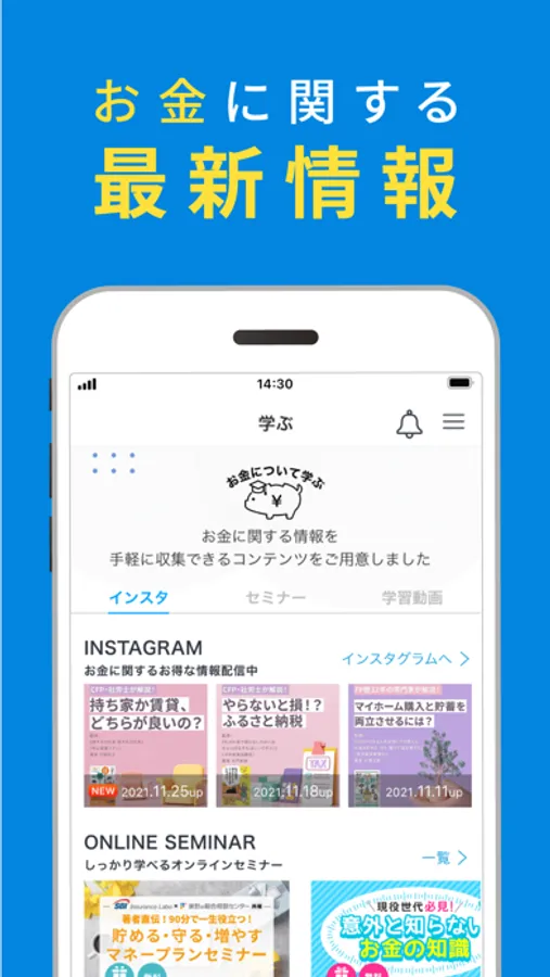 オンラインマネーセミナーや、3分の短編動画などでお金に関する最新情報をお届けしています。理想のマネープランの実現のためにぜひお役立てください!