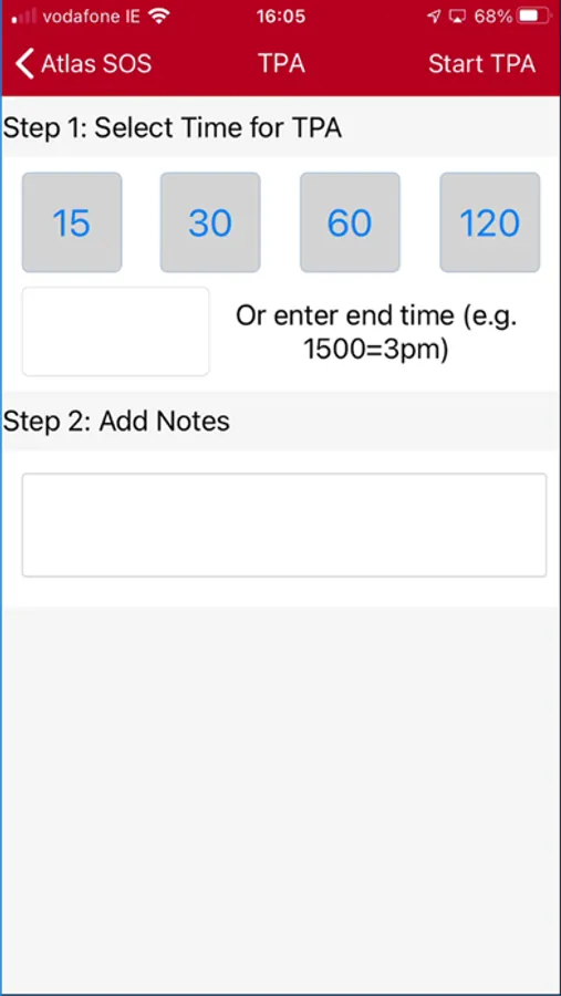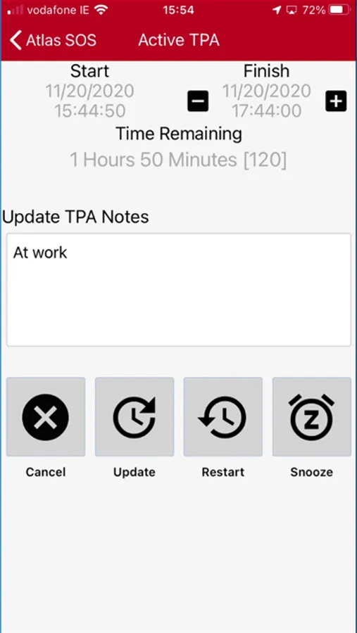 When the timer is started the user will receive a confirmation text message stating the start time and the number of minutes the timer will run for. At pre-set intervals, up to 4 reminder notifications within the app are given to the user. Users can extend the timer or cancel the timer at any point. If the user fails to stop the active TPA an alert will be automatically generated once the timer expires.