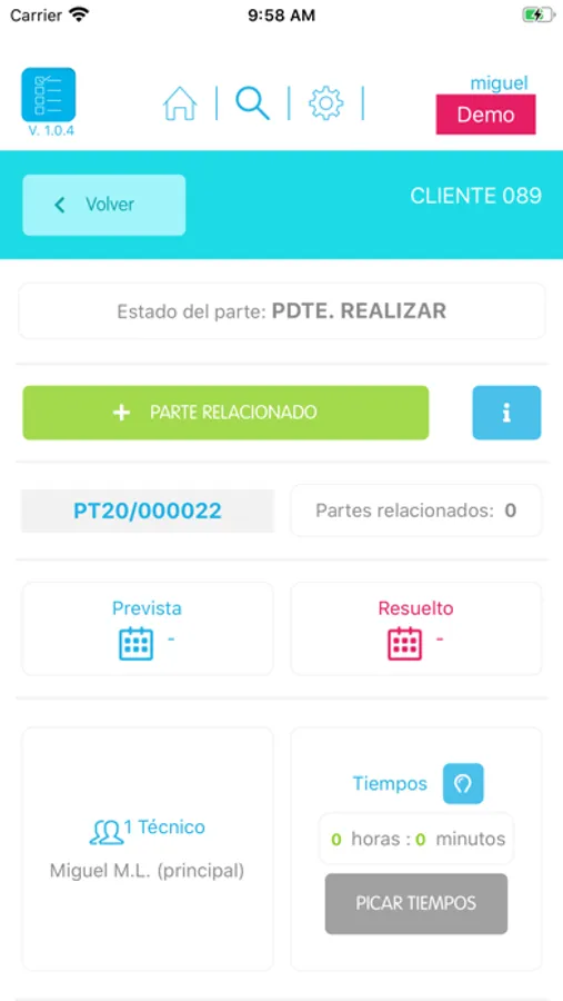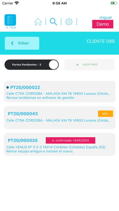 Al pulsar sobre uno de estos clientes, se carga el listado de todos los partes de trabajo que están pendientes de realizar, con independencia de que el técnico esté asignado o no en todos los partes que hay pendientes. Aquellos partes en los que el técnico está asignado aparecen los primeros en dicho listado y marcados con un punto verde.
