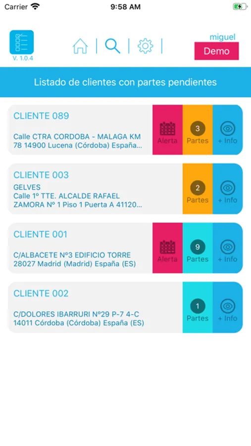 Nada más entrar el técnico en la APP, lo primero que se encuentra es el listado de clientes que tienen algún parte de trabajo en el que dicho técnico está asignado.